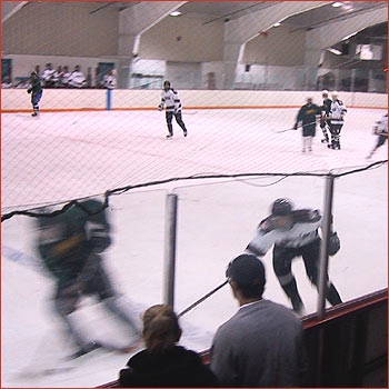 prev ::: next Then, after having some Egyptian-style chickpea soup that our neighbor Chris brought over, complete with a little plastic wrapped packet of grated parmesan cheese, we went to New Hampshire to see the hockey game. There's some tournament apparently. Tonight the Vermont Law team, the Fighting Swans, were playing the Harvard Business School team. About 30 VLS students showed up to cheer on the bedraggled Swans who lost 6 to 2. |
